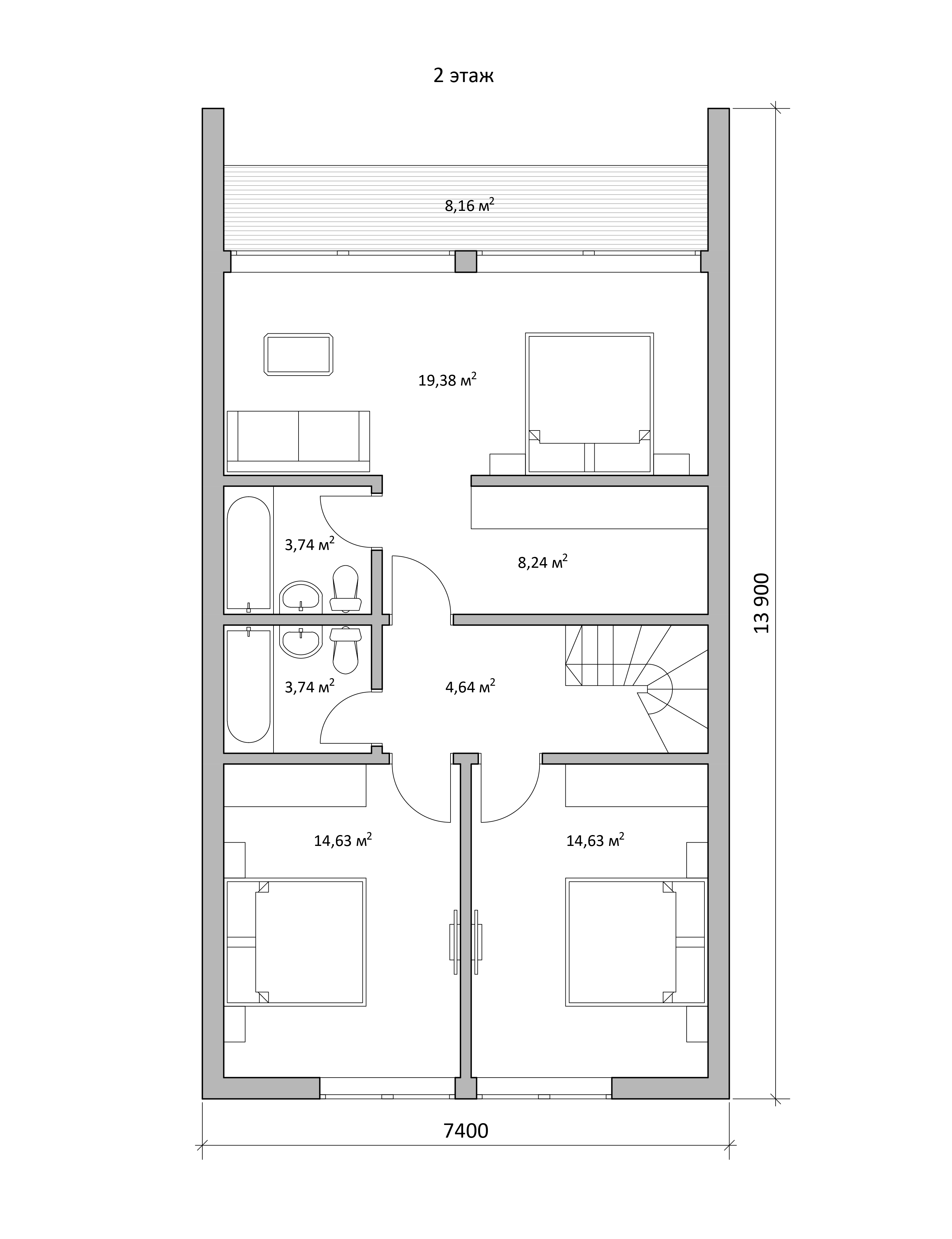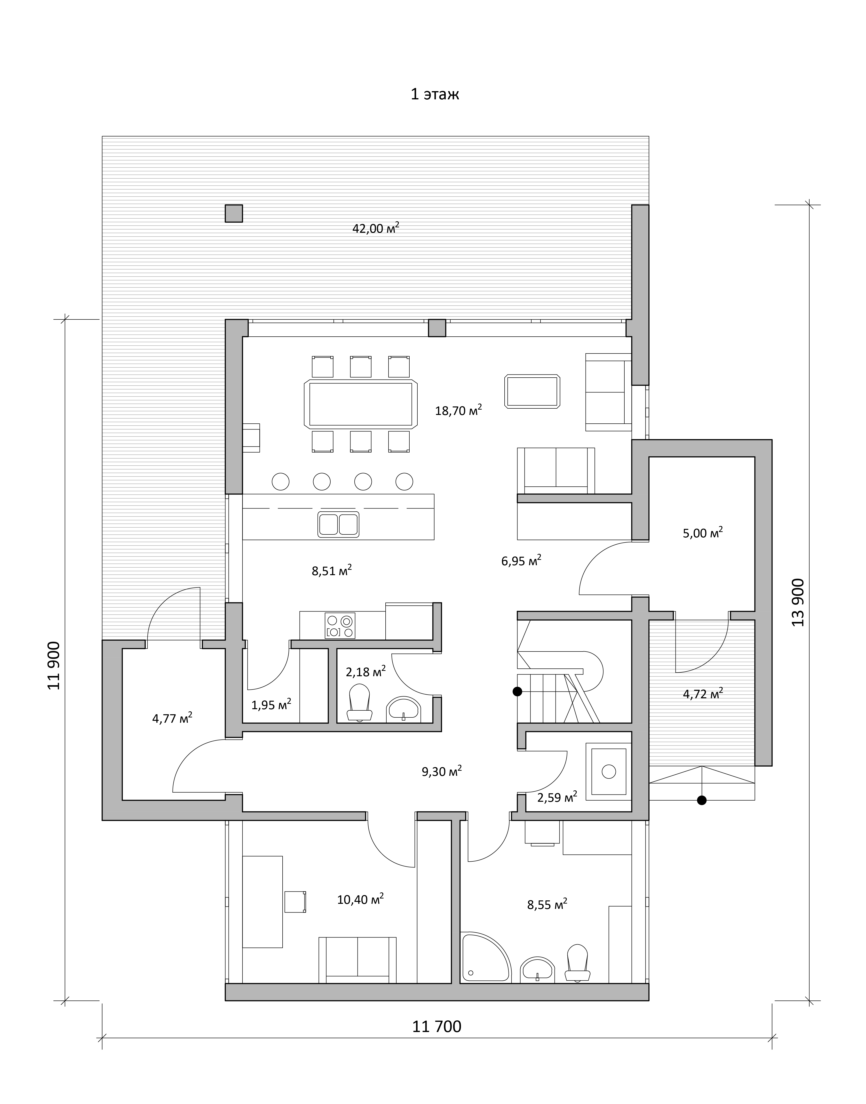Простота форм – коробка в виде вытянутого прямоугольника, двускатная крыша, минималные свесы. Жесткий каркас из опорных клееных балок. Второй свет на всей протяженности или в одной из торцевых частей. Панорамное остекление, максимум свободного пространств.