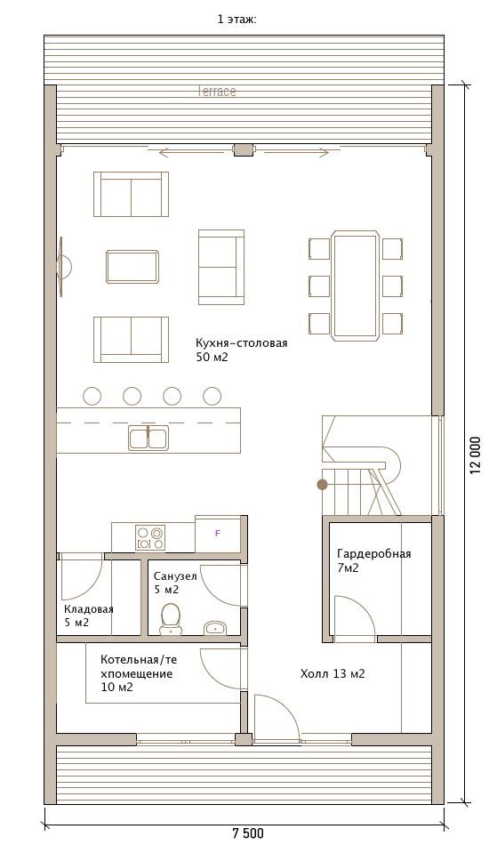 Простота форм – коробка в виде вытянутого прямоугольника, двускатная крыша, минималные свесы. Жесткий каркас из опорных клееных балок. Второй свет на всей протяженности или в одной из торцевых частей. Панорамное остекление, максимум свободного пространств.